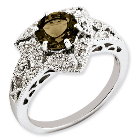 Round smoky quartz and diamond ring is made of polished sterling silver. Smoky quartz ct weight: 1.25. Diamond ct weight: 0.08. Weight: 3.75 grams. 7mm x 7mm round stone. Available in whole sizes 5-10 only. Imported.