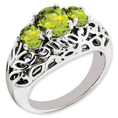 3-stone oval peridot ring is made of polished sterling silver and has a leaf design. Peridot total carat weight: 1.3. Weight: 6.59 grams. Available in whole sizes 5-10 only. Imported.
