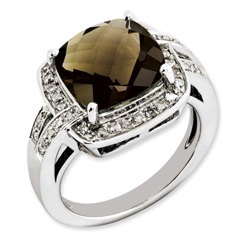 Polished sterling silver. Smokey Quartz ct weight: 5. Diamond ct weight: 0.2. Weight: 5.8 grams. 11mm x 11mm cushion checkerboard stone. Available in whole sizes 5-10 only. Imported.