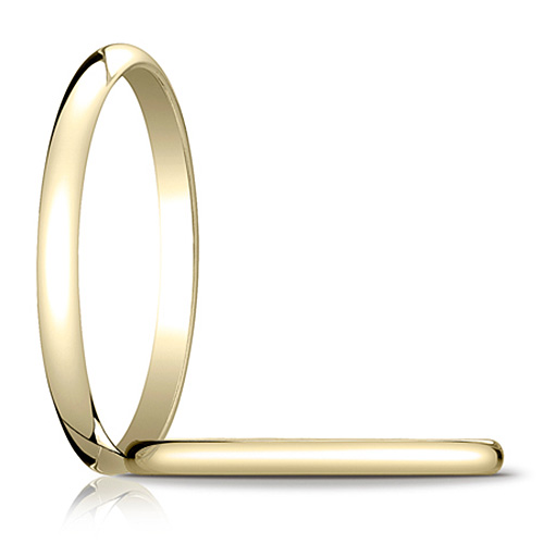 14kt yellow gold 2mm wedding band is die struck and standard fit. Oval center, polished finish. Thickness: 1.3mm. Made in USA.Manufacturer's Lifetime GuaranteeIf your ring is ever damaged during normal wear, the manufacturer will repair or replace your wedding ring free of charge. If your finger size ever changes, the manufacturer will resize or replace your ring free of charge. In the case that the manufacturer has to add material to your ring, you will only be charged for the difference in the additional metal or stones needed to restore the piece. Guarantee ParametersThe guarantee does not cover rings that have been ordered in the wrong finger size or finger sizes that may have changed between the time of purchase and the actual physical receipt of the piece. Third party alterations, other than engraving, will void the warranty.The manufacturer reserves the right to deny the Lifetime Guarantee for any ring that shows signs of abuse or tampering.