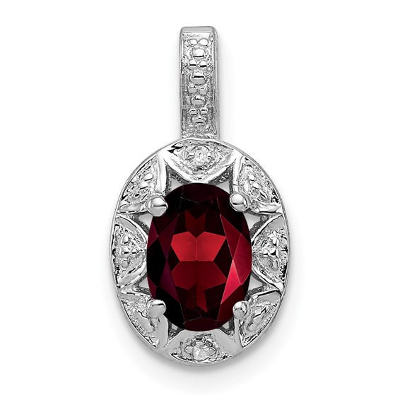 Oval garnet pendant with diamonds is made of polished sterling silver. 7mm x 5mm oval garnet. Diamond carat weight: 0.01. Imported.