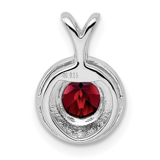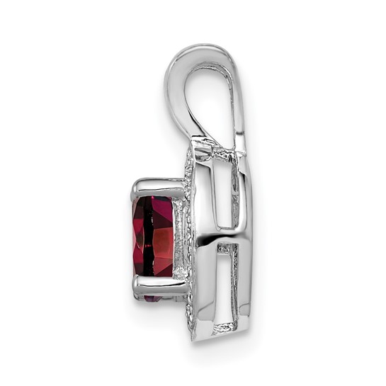Sterling silver garnet halo pendant has diamond accents. 1.1 carat round garnet, 6mm diameter, A quality. Diamond carat total weight: 0.01. Pendant size: 14mm x 10mm including bail. Made in India. Ships from USA.