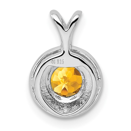 Sterling silver citrine halo pendant has diamond accents. 0.75 carat round citrine, 6mm diameter, A quality. Diamond carat total weight: 0.01. Pendant size: 14mm x 10mm including bail. Made in India. Ships from USA.