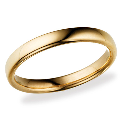This solid 14k yellow gold 3.5mm wedding band is die struck and comfort fit. Low dome profile and polished finish. Thickness: 2.3mm. Made in USA.