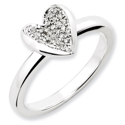 Polished sterling silver stackable ring has a heart with diamond accents. Diamond ct weight: 0.13. Ring width: 2.25mm. Weight: 4.01 grams. Available in whole sizes 5-10 only. Imported.