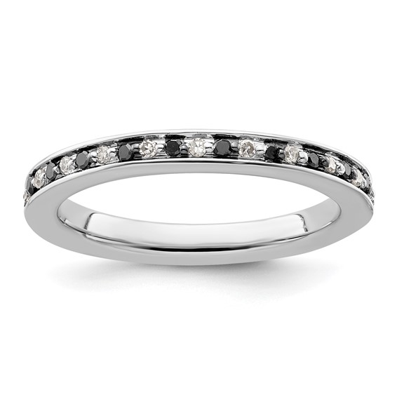 Polished sterling silver stackable ring features channel set black and white round diamonds. Diamond ct weight: 0.3. Ring width: 2.25mm. Weight: 2.75 grams. Available in whole sizes 5-10 only. Imported.
