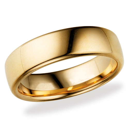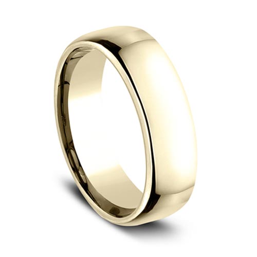 Solid 14k yellow gold 6.5mm wedding band is die struck and comfort fit. Polished finish. Thickness: 2.3mm. Made in USA.