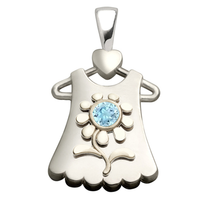 This flower dress pendant is made of polished sterling silver and features a round genuine aquamarine. Aquamarine is the birthstone for March. Item dimensions: 25mm x 15mm, the size of a quarter. This pendant is part of the Ones We Love jewelry collection.