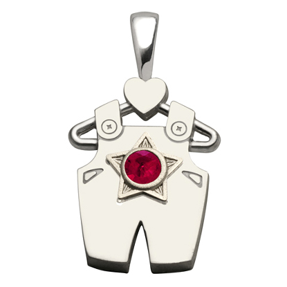 This boy's overalls pendant is made of polished sterling silver and features a round synthetic ruby. Ruby is the birthstone for July. This pendant is part of the Ones We Love jewelry collection.