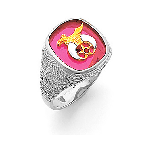 Polished 10kt white gold Shrine ring features a pebble grain shank. Shrine insignia sits atop your choice of a red, blue or black onyx stone. Choose solid or open back. Made in USA.