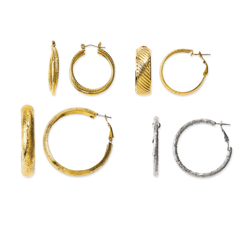 Jacqueline Kennedy hoops set includes 4 pairs of earrings. Tibbed gold-tone, polished gold-tone, gold-tone with a rope design and silver-tone with a rope design. Three pair of earrings with 24k gold platting and one pair with rhodium plating. Imported. Part of the Jackie Kennedy collection.Each piece of Camrose & Kross jewelry is guaranteed for life against defects in workmanship. This includes plating chipping or wearing, stones falling out or defective hardware or findings. Watches fall under the same warranty, except for their movements, which are guaranteed for one year.Each piece of jewelry is gift boxed in a velour covered steel case and comes with a Camrose & Kross certificate of authenticity. Also included is a romance card with some fascinating information about Jackie and her life.