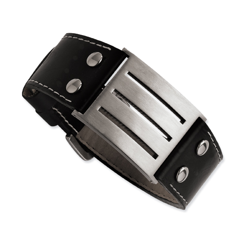 Men's genuine black leather bracelet boasts a large, brushed and slotted stainless steel plate and adjustable buckle. Length: 8 3/4in. Weight: 62.9 grams. This bracelet is composed of grade 316 stainless steel, known for its superior corrosion resistance. Imported.