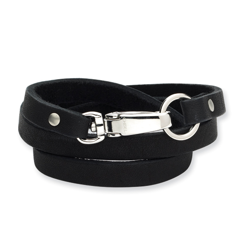 Men's genuine black leather wrap bracelet is secured with a polished stainless steel clasp. Length: 25in. Weight: 25.3 grams. One size fits most. This bracelet is composed of grade 316 stainless steel, known for its superior corrosion resistance. Imported.