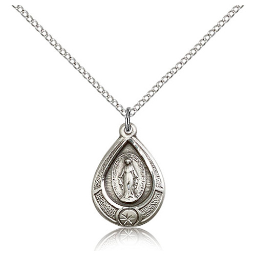 Sterling silver tear drop shaped miraculous medal dangles from an 18-inch sterling silver lite curb chain with lobster clasp. Dimensions: 3/4in x 1/2in. This item is the size of a penny. Made in USA. Die struck, hand-engraved.