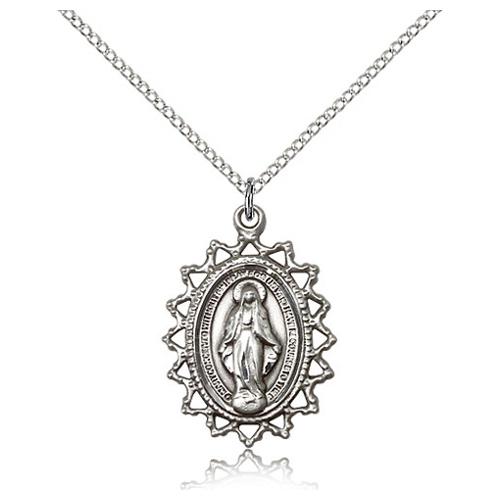 Die struck, hand-engraved miraculous medal. Free 18-inch sterling silver lite curb chain with lobster clasp. Dimensions: 1in x 3/4in. This item is the size of a quarter. Made in USA.