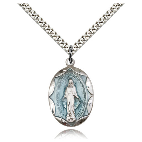 Oval sterling silver miraculous medal has blue epoxy enamel. 24-inch stainless steel heavy curb endless chain with silver plating. Dimensions: 1in x 5/8in. The back of the medal features an M, surmounted by a cross, with 2 hearts and 12 stars. This item is the size of a quarter. Die struck, hand-engraved. Made in USA.