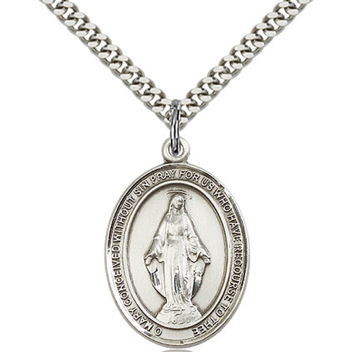 Sterling silver oval miraculous medal dangles from a 24-inch stainless steel heavy curb endless chain with silver plating. Dimensions: 1in x 3/4in. This item is the size of a quarter. Die struck, hand-engraved. Made in USA.