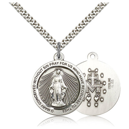 This round miraculous medal is made of sterling silver and dangles from a 24-inch stainless steel, endless heavy curb chain with silver plating. Dimensions: 1in x 7/8in. This item is the size of a nickel. Die struck, hand-engraved. Chain width: 2.8mm. Made in USA.