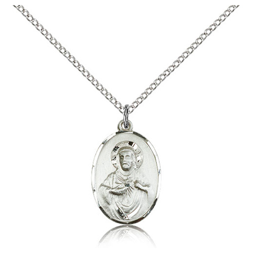 This oval scapular medal is made of sterling silver. 18-inch sterling silver lite curb chain with lobster clasp. Dimensions: 3/4in x 1/2in. This item is the size of a penny. Reverse side has the lady of Mount Carmel. Die struck, hand-engraved. Made in USA.