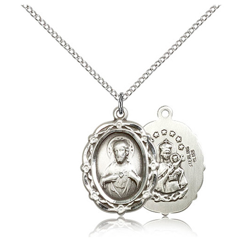 This sterling silver oval scapular medal has a fancy border. 18-inch sterling silver lite curb chain with lobster clasp. Dimensions: 7/8in x 5/8in. This item is the size of a nickel. Die struck, hand-engraved medal is made in USA.