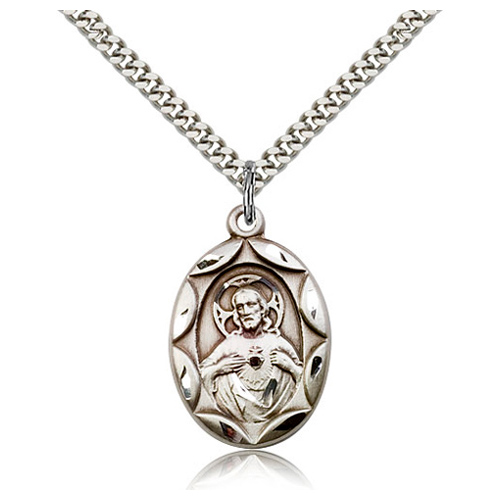 Men's sterling silver scapular medal dangles from a 24-inch stainless steel heavy curb chain with lobster clasp. Medal size: 1in x 5/8in. This item is the size of a quarter. Die struck, hand-engraved. Made in USA.
