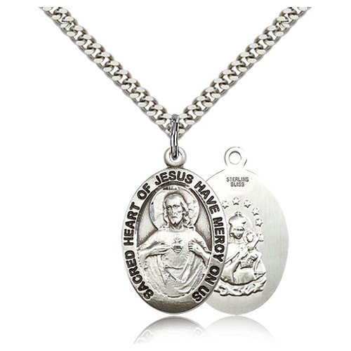 Die struck, hand-engraved sterling silver scapular medal. 24-inch stainless steel, endless heavy curb chain with silver plating. Dimensions: 1in x 5/8in. This item is the size of a quarter. Inscription: SACRED HEART OF JESUS HAVE MERCY ON US. Made in USA.