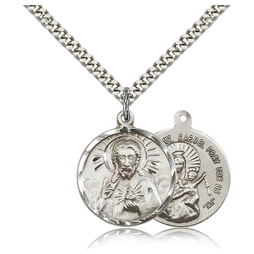 Die struck, hand-engraved scapular medal. Free 24-inch stainless steel, endless heavy curb chain with silver plating. Dimensions: 7/8in x 3/4in. This item is the size of a penny. Made in USA.