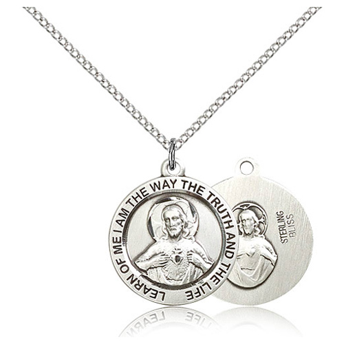 This round sterling silver scapular medal has a 18-inch sterling silver lite curb chain with lobster clasp. Item size: 3/4in x 3/4in. This item is the size of a penny. Inscription: LEARN OF ME I AM THE WAY THE TRUTH AND THE LIFE. Die struck, hand-engraved scapular medal. Made in USA.