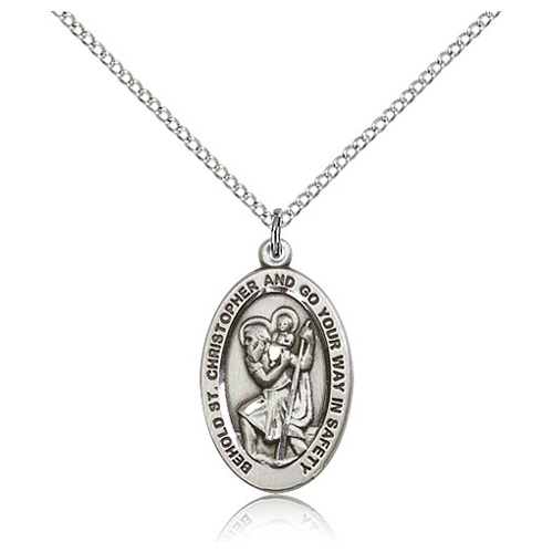 Die struck, hand-engraved St Christopher medal is made of solid sterling silver. Inscription: BEHOLD ST CHRISTOPHER AND GO YOUR WAY IN SAFETY. Free 18-inch sterling silver lite curb chain with lobster clasp. Dimensions: 7/8in x 1/2in. This item is the size of a nickel. Made in USA.