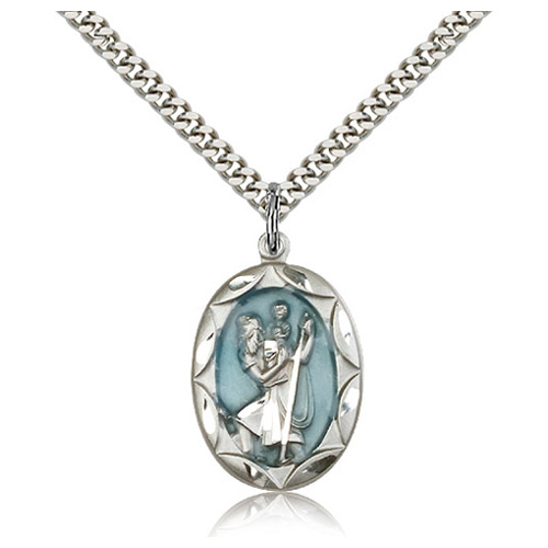 Die struck, hand-engraved St Christopher medal has blue epoxy enamel. 24-inch stainless steel, endless heavy curb chain with silver plating. No inscription. Dimensions: 1in x 5/8in. This item is the size of a quarter. Made in USA.