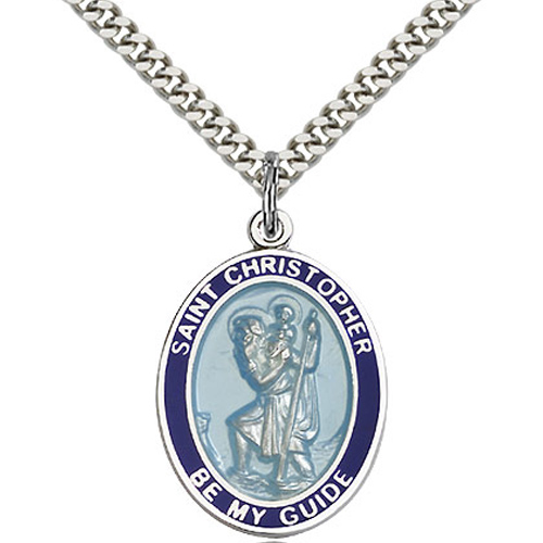Die struck, hand-engraved St Christopher medal has two-tone blue expoxy enamel. Inscription: SAINT CHRISTOPHER BE MY GUIDE. 24-inch stainless steel, endless heavy curb chain with silver plating. Dimensions: 1in x 3/4in. This item is the size of a quarter. Made in USA.