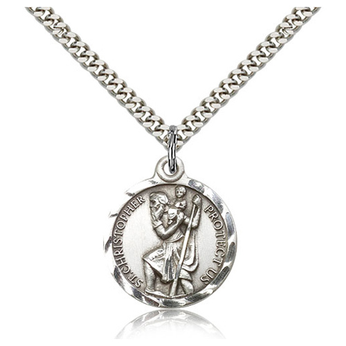 Die struck, round hand-engraved St Christopher medal is made of sterling silver. Dimensions: 7/8in x 3/4in. This item is the size of a nickel. Inscription: SAINT CHRISTOPHER PROTECT US. 24-inch stainless steel, endless heavy curb chain with silver plating. Made in USA.