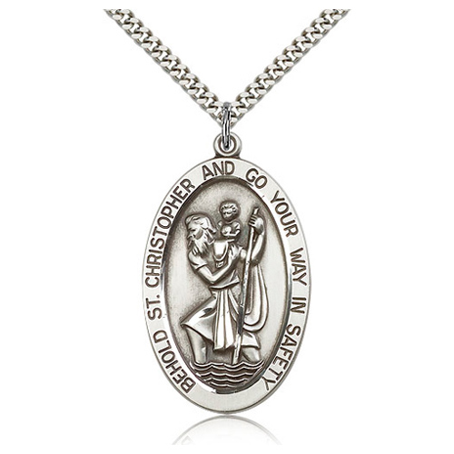 This jumbo oval St Christopher medal is made of sterling silver. Dimensions: 1 5/8in x 1in. 24-inch stainless steel, endless heavy curb chain with silver plating. This item is the size of a half dollar. Inscription: BEHOLD ST. CHRISTOPHER AND GO YOUR WAY IN SAFETY. Made in USA.