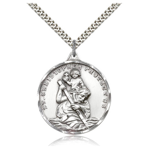 Die struck, hand-engraved round St Christopher medal is made of sterling silver. Inscription: ST CHRISTOPHER PROTECT US. 24-inch stainless steel, endless heavy curb chain with silver plating. Dimensions: 1 3/8in x 1 1/8in. This item is larger than a quarter. Made in USA.