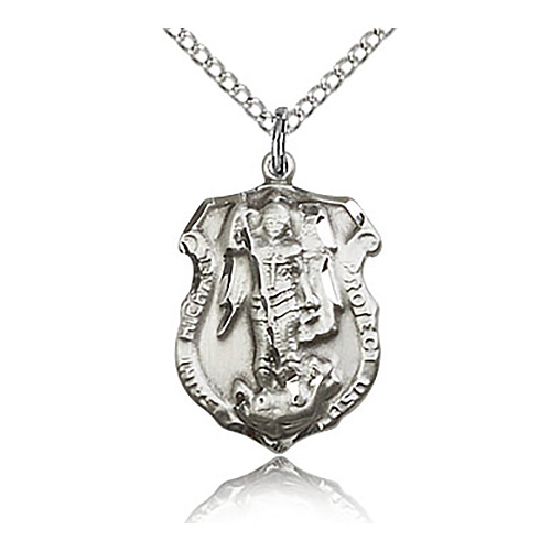 Die struck, hand-engraved St Michael shield pendant is made of sterling silver. Item size: 3/4in x 1/2in with jump ring. 18-inch sterling silver lite curb chain with lobster clasp. This item is the size of a penny. Made in USA.