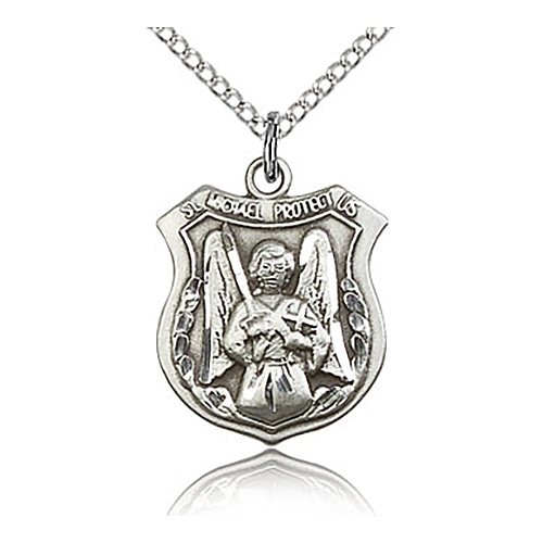 Die struck, hand-engraved St Michael shield pendant and 18-inch sterling silver lite curb chain with lobster clasp. Dimensions: 3/4in x 1/2in with jump ring. This item is the size of a penny. Made in USA.