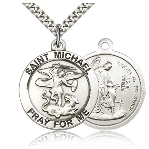 Die struck, hand-engraved round St Michael medal is made of sterling silver. Inscription: SAINT MICHAEL PRAY FOR ME. Reverse side depicts a guardian angel. Dimensions: 1in x 7/8in. This item is the size of a quarter. 24-inch stainless steel, endless heavy curb chain with silver plating. Chain width: 2.8mm. Made in USA.