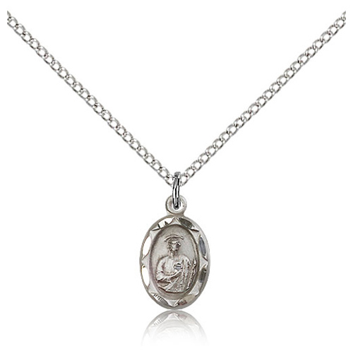 This very small oval St Jude Thaddeus charm is made of sterling silver. No inscription. 18-inch sterling silver lite curb chain with lobster clasp. Plain back. Dimensions: 1/2in x 1/4in. This item is half the size of a quarter. Made in USA.