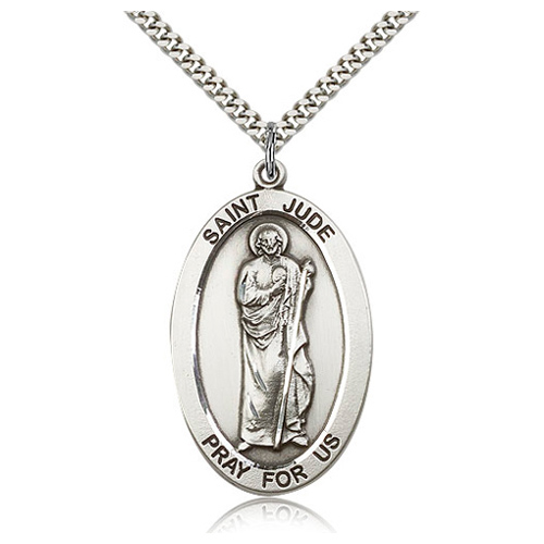 This large die struck, hand-engraved St Jude medal is made of sterling silver. 24-inch stainless steel, endless heavy curb chain with silver plating. Dimensions: 1 5/8in x 1in. This item is the size of a half dollar. Inscription: SAINT JUDE PRAY FOR US. Made in USA.