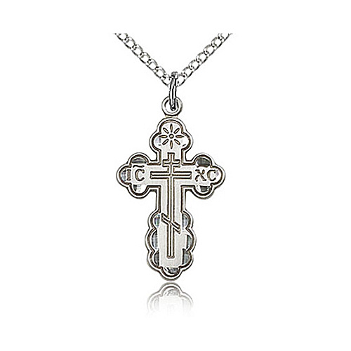 Die struck, hand-engraved orthodox cross pendant hangs from an 18-inch sterling silver lite curb chain with lobster clasp. Dimensions: 7/8in x 1/2in with jump ring. This item is the size of a nickel. Made in USA.