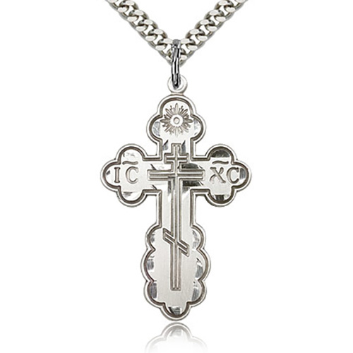 Die struck, hand-engraved orthodox cross is made of sterling silver. Dimensions: 1 3/8in x 7/8in. 24-inch stainless steel, endless heavy curb chain with silver plating. This cross is larger than a quarter. IC XC letters are engraved on the front. Made in USA.