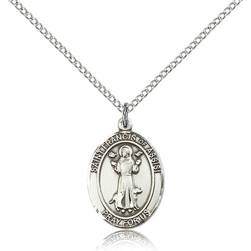 Die struck, hand-engraved St Francis medal is made of sterling silver. Dimensions: 3/4in x 1/2in. 18-inch sterling silver lite curb chain with lobster clasp. Plain back. This item is the size of a penny. Inscription: SAINT FRANCIS OF ASSISI PRAY FOR US. Made in USA.