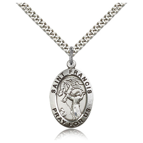 Die struck, hand-engraved St Francis medal for men is made of antiqued sterling silver. 24-inch stainless steel, endless heavy curb chain with silver plating. Dimensions: 1in x 5/8in. This item is the size of a quarter. Inscription reads: SAINT FRANCIS PRAY FOR US. Made in USA.