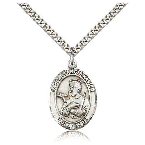Die struck, hand-engraved St Francis Xavier medal is made of sterling silver. Item size: 1in x 3/4in. 24-inch stainless steel, endless heavy curb chain with silver plating. This item is the size of a quarter. Inscription: SAINT FRANCIS XAVIER PRAY FOR US. Made in USA.