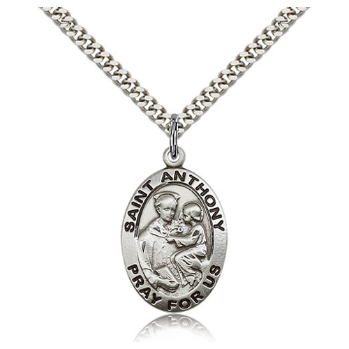 Die struck, hand-engraved oval St Anthony medal is made of sterling silver. Dimensions: 1in x 5/8in. Inscription reads: SAINT ANTHONY PRAY FOR US. 24-inch stainless steel, endless heavy curb chain with silver plating. This item is the size of a quarter. Made in USA.