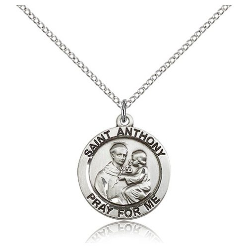 This round St Anthony medal is made of antiqued sterling silver. Dimensions: 3/4in x 3/4in. 18-inch sterling silver lite curb chain with lobster clasp. Inscription: SAINT ANTHONY PRAY FOR ME. Plain back. This item is the size of a penny. Die struck, hand-engraved medal is made in USA.