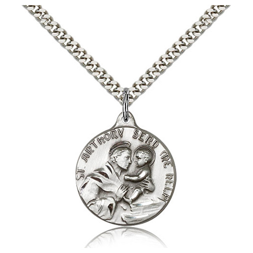 Die struck, hand-engraved round St Anthony medal is made of polished sterling silver. Dimensions: 7/8in x 3/4in. Inscription: ST. ANTHONY SEND ME HELP. The medal dangles from a 24-inch stainless steel, endless heavy curb chain with silver plating. This item is the size of a nickel. Made in USA.