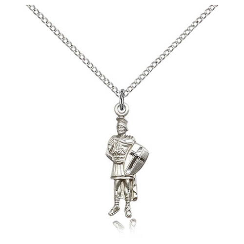 Die struck, hand-engraved St Florian figure pendant is made of sterling silver. Dimensions: 1in x 3/8in with jump ring. 18-inch sterling silver lite curb chain with lobster clasp. This item is the size of a quarter. Made in USA.