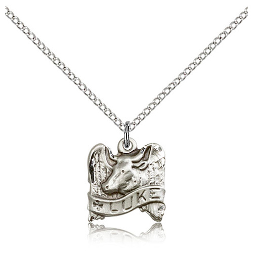Die struck, hand-engraved St Luke animal medal is made of solid sterling silver. 18-inch sterling silver lite curb chain with lobster clasp. Dimensions: 1/2in x 1/2in with jump ring. This item is half the height of a quarter. Made in USA.