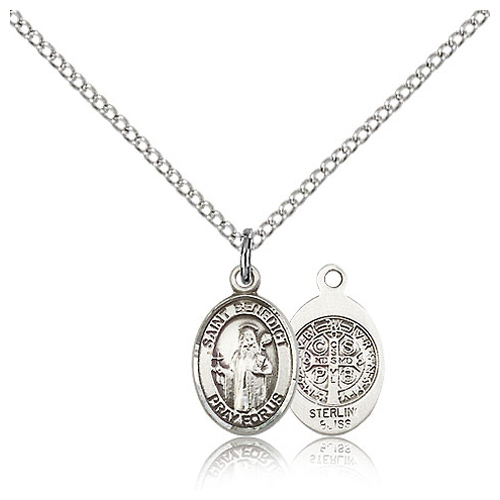 Hand-engraved St Benedict charm dangles from a sterling silver 18-inch curb chain with lobster clasp. Plain back. Dimensions: 1/2in x 1/4in. This item is half the height of a quarter. Made in USA.
